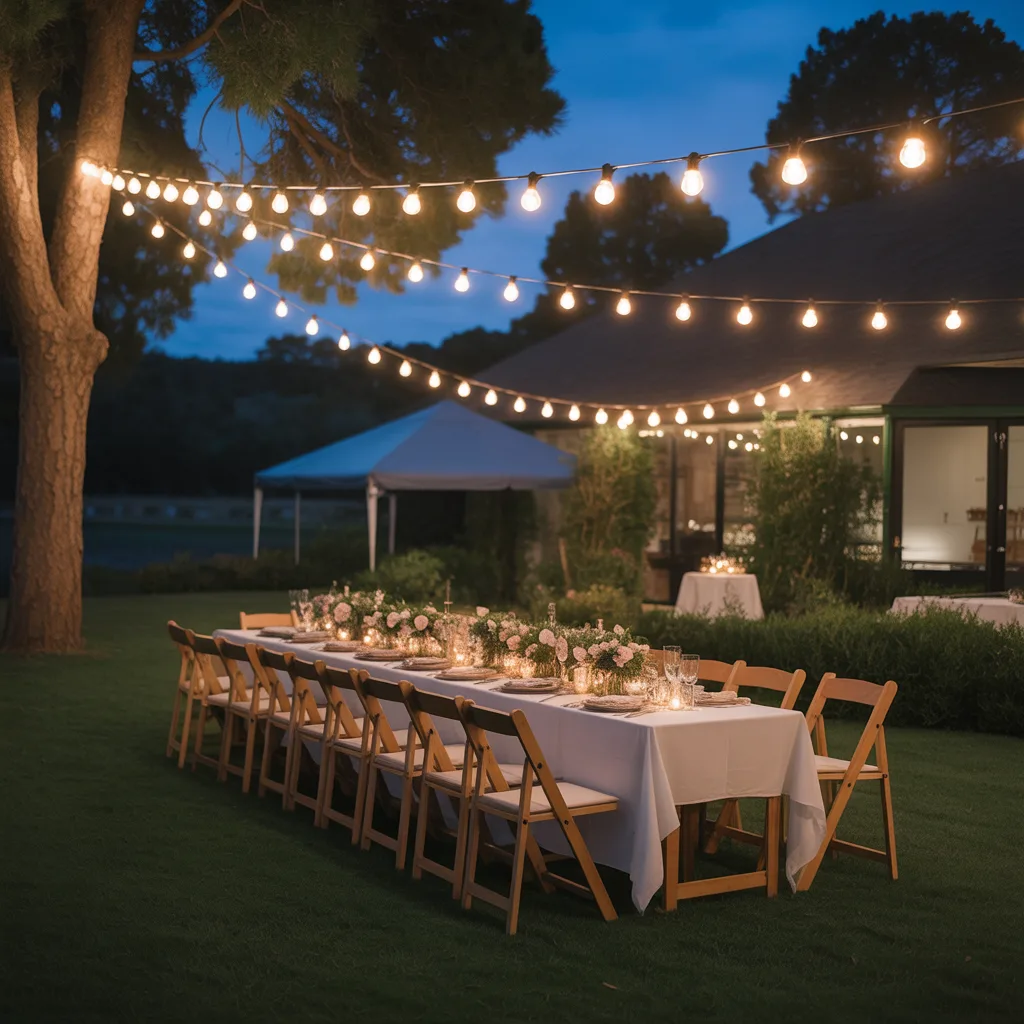 Hang string lights over your backyard or garden venue. As evening falls, the twinkle lights create a cozy, romantic atmosphere that’s perfect for dinner, dancing, and dreamy photo ops.